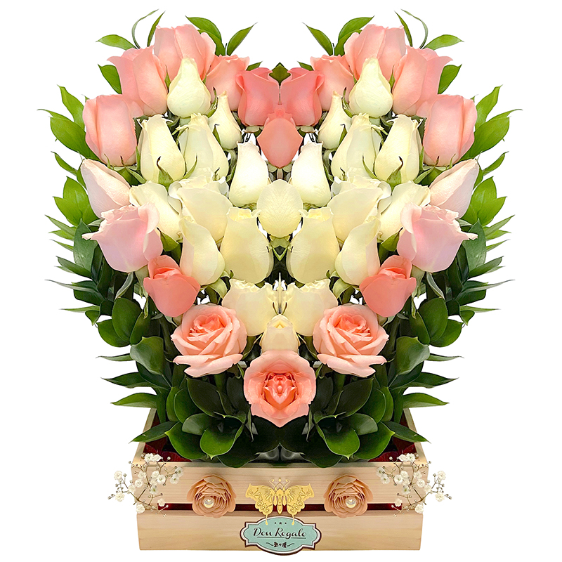 Este hermoso arreglo floral sentado en una base de madera en forma de corazón inspirado en los enamorados consta de 24 rosas blancas y 21 rosas color palo rosa.