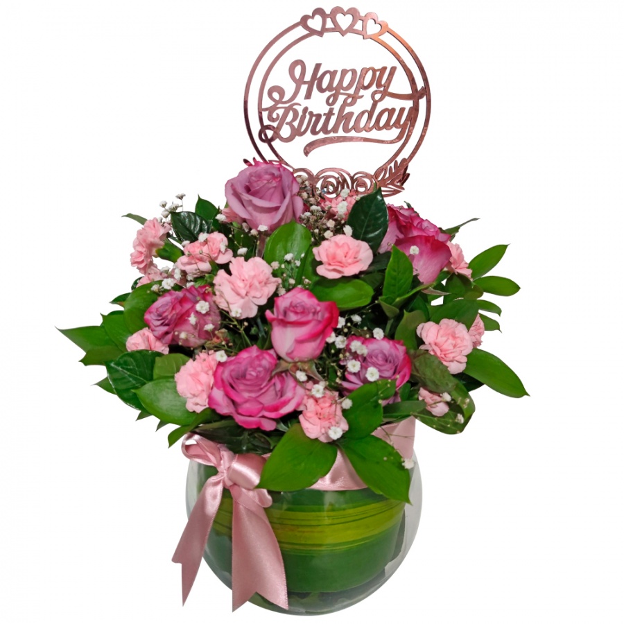 Un hermoso florero de rosas y flores mixtas, finamente decorado.